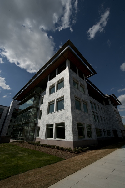 The 200,000-square-foot, $68-million building houses two distinct components. One portion of the building is wet laboratory space comprised of 90 molecular biology laboratory modules, a drug discovery laboratory module and a nuclear magnetic resonance laboratory. A separate portion of the building includes an auditorium, café and dry research space that houses laboratories, conference space, formal and informal collaboration spaces, support space, a Biosafety Level 3 laboratory suite and a 10,500-square-foot vivarium.