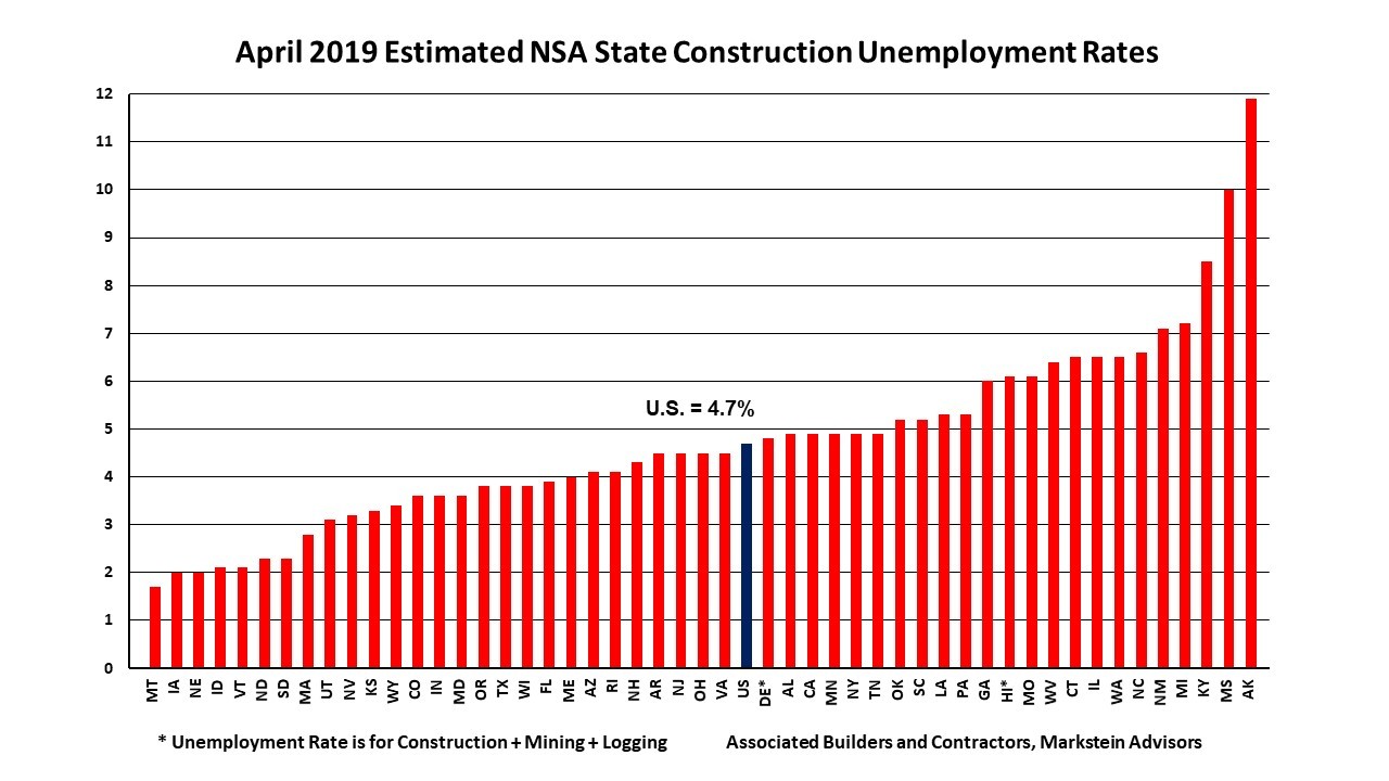 As the April 2019 national NSA construction unemployment rate fell 1.8% from a year ago to 4.7%, the construction industry employed 256,000 more workers nationally compared to April 2018, according to BLS numbers.
