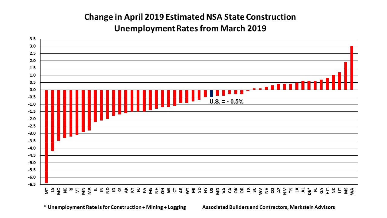 The national NSA construction unemployment rate fell 0.5% from March to April. A decrease in the monthly rate is the normal pattern, having fallen every April since the report first began in 2000. Among the states, 33 posted lower estimated construction unemployment rates from March and 17 higher.