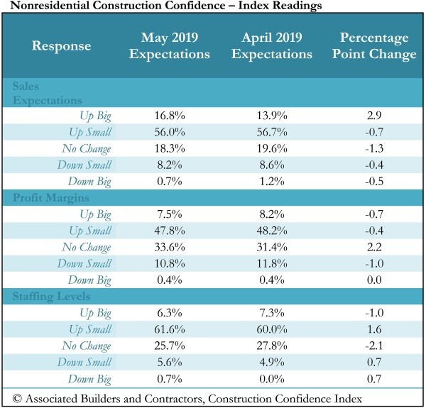 U.S. construction industry leaders remained upbeat regarding nonresidential construction’s near-term prospects in May 2019, according to the Construction Confidence Index released by Associated Builders and Contractors.