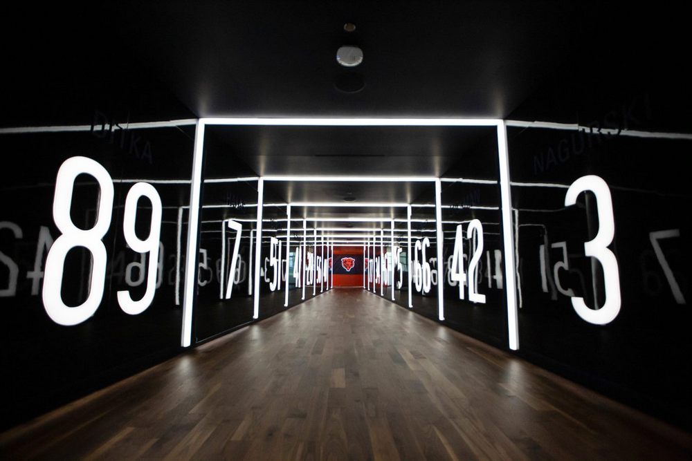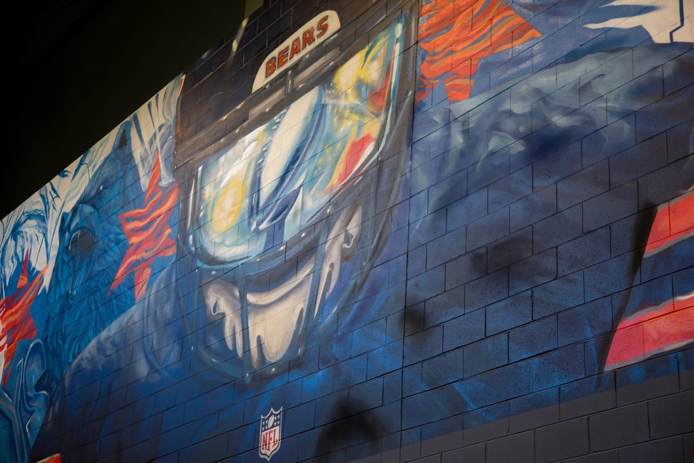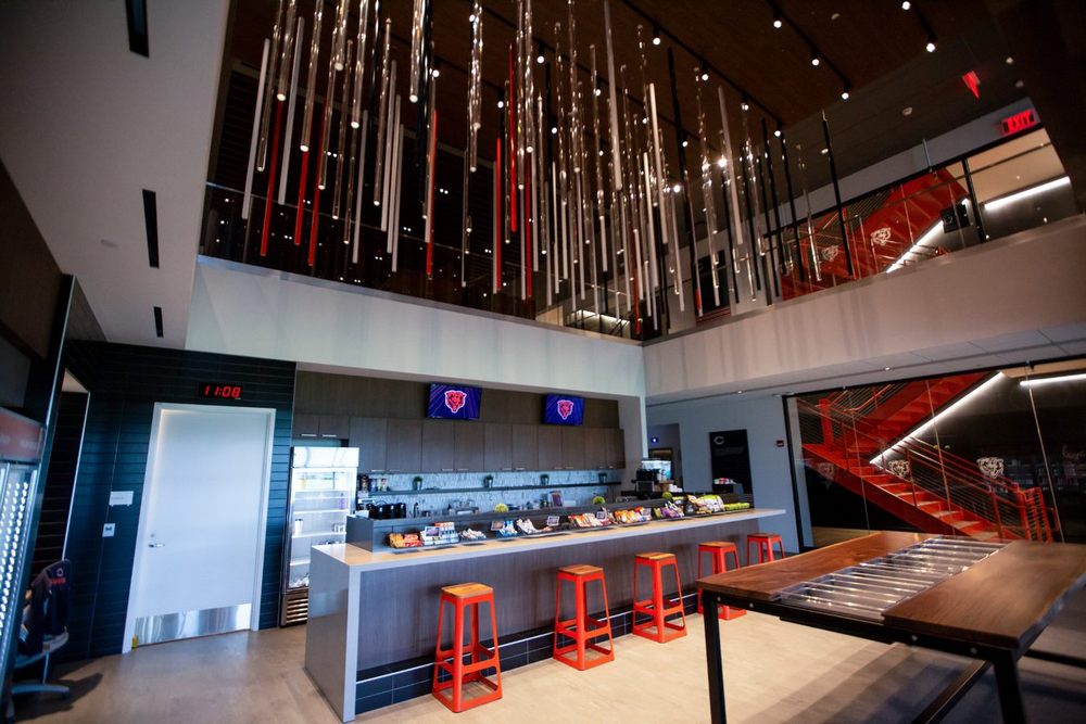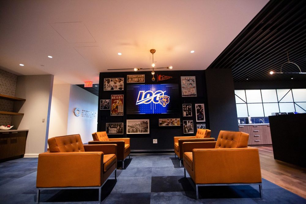 New design elements include a brick wall featuring the Chicago Bears traditions script, four individual walls each highlighting a core value (respect, integrity, team, excellence), messaging on various walls displaying the Bears mission statement and inspirational quotes, a customized neon ceiling light of George S. Halas’ signature, a ceiling sculpture representing 100 years of Bears’ records and a 14-by-45-foot mural designed by Czr Prz in the indoor turf space. The main lobby also features video board that is 28 feet by 5 feet 7 inches. There are approximately 175 video displays in the renovated space.