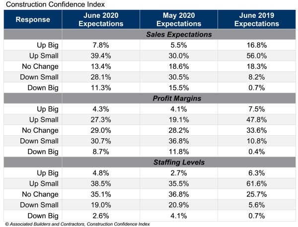 ABC’s Construction Confidence Index readings for sales, profit margins and staffing levels expectations all increased in June, although profit margin expectations remain below the threshold of 50, indicating ongoing expectations of contraction. More than 47% of contractors expect their sales to increase over the next six months compared to 39% who expect declining sales over that period.