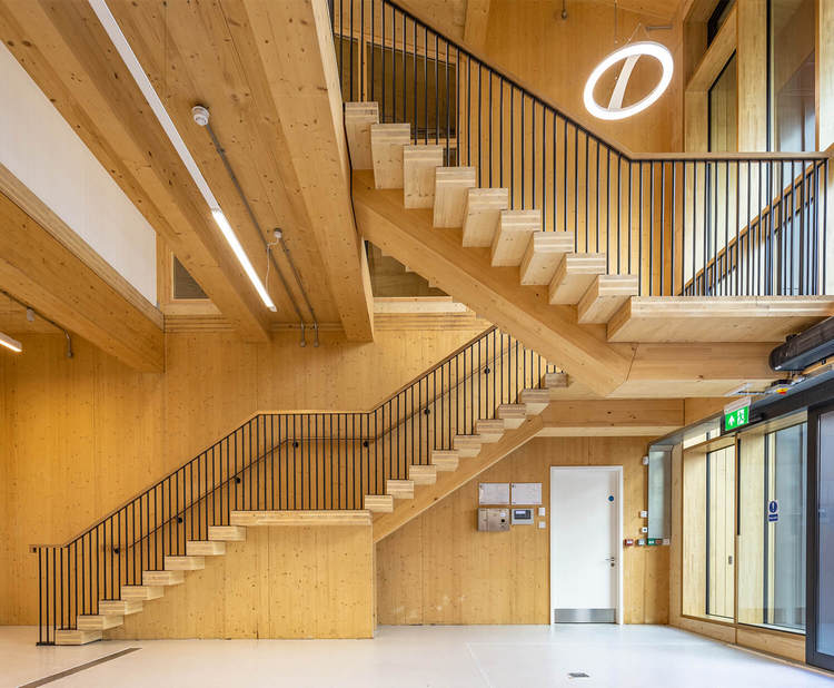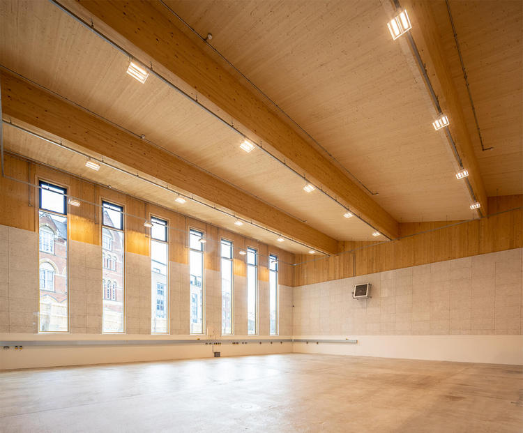The building’s position, just three meters above the underground tunnels of the Thameslink railway line, created a unique design challenge meaning the building needed to be designed using lightweight materials and with shallow foundations. The Sports Hall is primarily constructed using a cross-laminated timber frame and glulam timber columns, a natural alternative to steel and concrete that is both lightweight and carbon friendly. It is clad in zinc and has a super-lightweight concrete substructure that runs perpendicular to the tunnels to prevent concentrated loads. The serrated roof and façades of the building are a nod to its railway context and heritage.