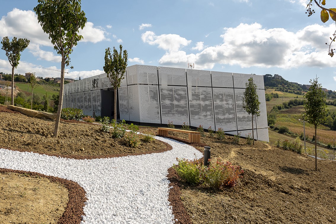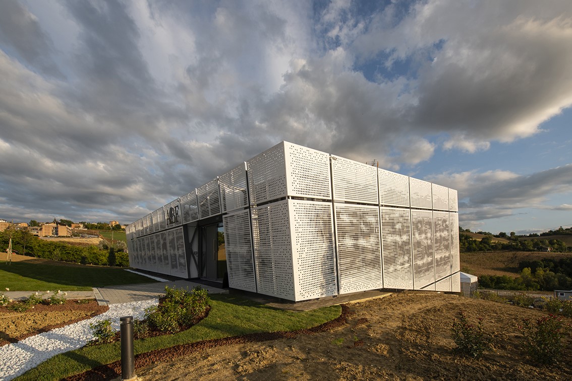 The project not only returns the local Academy of Music to Camerino, aimed at welcoming over 160 students and the many cultural initiatives of the community, but also gives the university city a new architectural identity. With clean and elegant lines, the building, which is spread over two levels for a total of 700 square meters, stands out for its ethereal skin in white sheet metal panels with perforations of varying size.