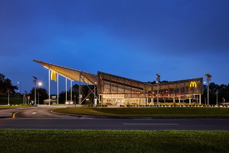The McDonald’s Flagship-Disney, located in Orlando, Florida, recently completed construction, and aims to become the first net-zero restaurant in the quick-service industry. Under a shed clad in solar panels, the 8,024-square-foot restaurant, built by Southland Construction and designed by Ross Barney Architects, was envisioned and developed in response to the Florida climate.
