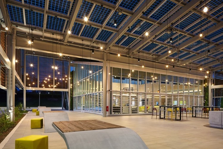 Energy consumption is reduced by optimizing building and kitchen systems. Energy is generated onsite by 18,727 square feet of photovoltaic panels, 4,809 square feet of glazing integrated photovoltaic panels and 25 off-the-grid parking lot lights produce more energy than the restaurant uses.