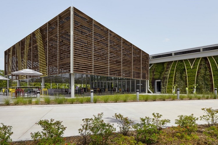 As Orlando experiences significant humidity, the building is naturally ventilated approximately 65% of the year. Jalousie windows, operated by outdoor humidity and temperature sensors, close automatically when air conditioning is required. An outdoor porch featuring wood-louvered walls creates an extension of the indoor dining room.