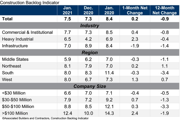 Associated Builders and Contractors reported today that its Construction Backlog Indicator rose to 7.5 months in January 2021, an increase of 0.2 months from its December 2020 reading, according to an ABC member survey conducted from Jan. 20 to Feb. 2. Despite the monthly uptick, backlog is 0.9 months lower than in January 2020.
