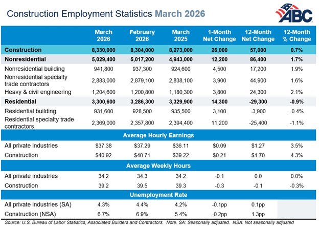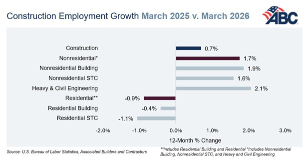 “Construction employment rebounded in March as both the residential and nonresidential segments added jobs for the month,” said ABC Chief Economist Anirban Basu. “Industrywide employment has expanded by an average of 19,300 jobs per month in 2026. That’s a marked improvement from 2025, when construction employment actually declined, but there remains cause for concern about the industry’s outlook.