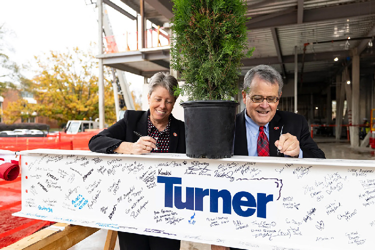The historic occasion was celebrated with a topping-out ceremony where UGA President Jere W. Morehead and School of Medicine Founding Dean Shelley Nuss inked their signatures on the final piece of the structure.